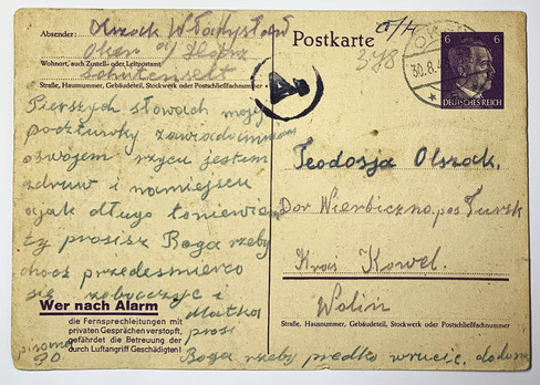 В перших словах листівки, повідомляю про моє життя. Я живий і на тому ж місці. Чи на довго, того не знаю. Ти просиш Бога аби принаймні перед смертю побачитись і Мама просить Бога аби швидко повернутися додому. І так, кохано Федсю, пишеш мені що там у тебе і питаєш як там у мене. Все по старому. А що сталося з моїм братем Генком, то ти мені не напішеш. Думаєш, що я не знаю? Я все добре знаю. Ще про свою кохану Маму не знаю чи вона живе. Прикро мені, але що я зроблю? Хотів би побачитися зі своєю коханою мамою. … А те, що мій коханий брат загинув через Костку Кубу, якщо це правда, що через нього, то буде мати відплату. Отримав 5 пачок, 1 з тютюном, а решу булочки і трохи сала. Ольшак